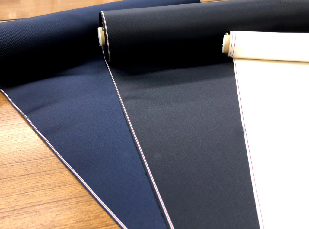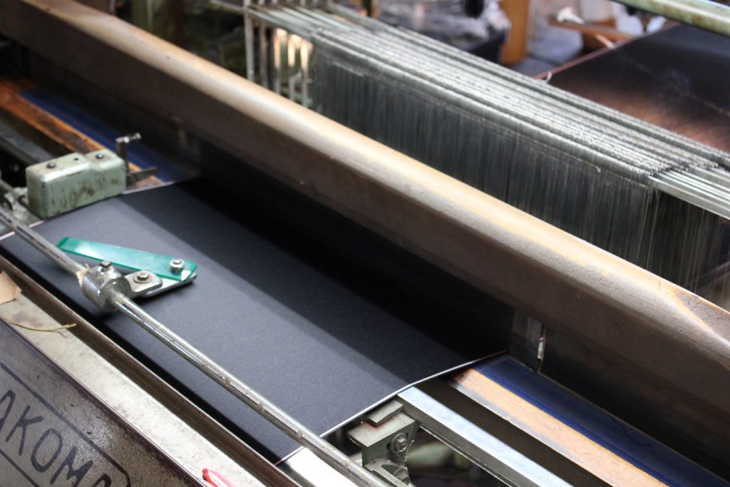 それとは違いタキシードの衿に使用する拝絹地や蝶ネクタイ、カマーバンドは重厚さ、しっかりとしたコシと厚みが必要な為、打ち込み本数の多さ、糸の太さが求められます。